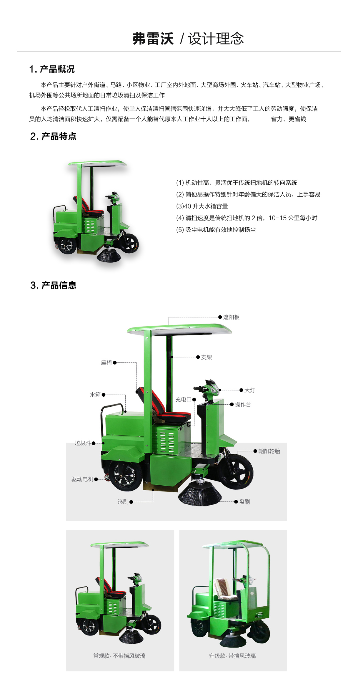 產品分類:駕駛式掃地機(可加裝擋風玻璃)產品特點:1、駕駛式掃地機FL1650配備出口型免維護電瓶,區(qū)別于市面上其他電動掃地機,其智能型充電機能有效延長電瓶使用壽命,可使連續(xù)工作時間更長。2、操作簡單、便捷,對于年齡較大的保潔人員也可以無需通過特別培訓即可上崗使用。3、雙邊刷設計,顯著提升清掃效率,完成1000㎡的地面清掃工作僅需5分鐘。4、配備優(yōu)良吸塵電機和曬水系統,能夠在清掃地面灰塵時灑水,有效避免揚塵的產生。適用環(huán)境:戶外街道、小區(qū)物業(yè)、工廠車間、商場、車間、機場、學校、醫(yī)院、公園、廣場等地。