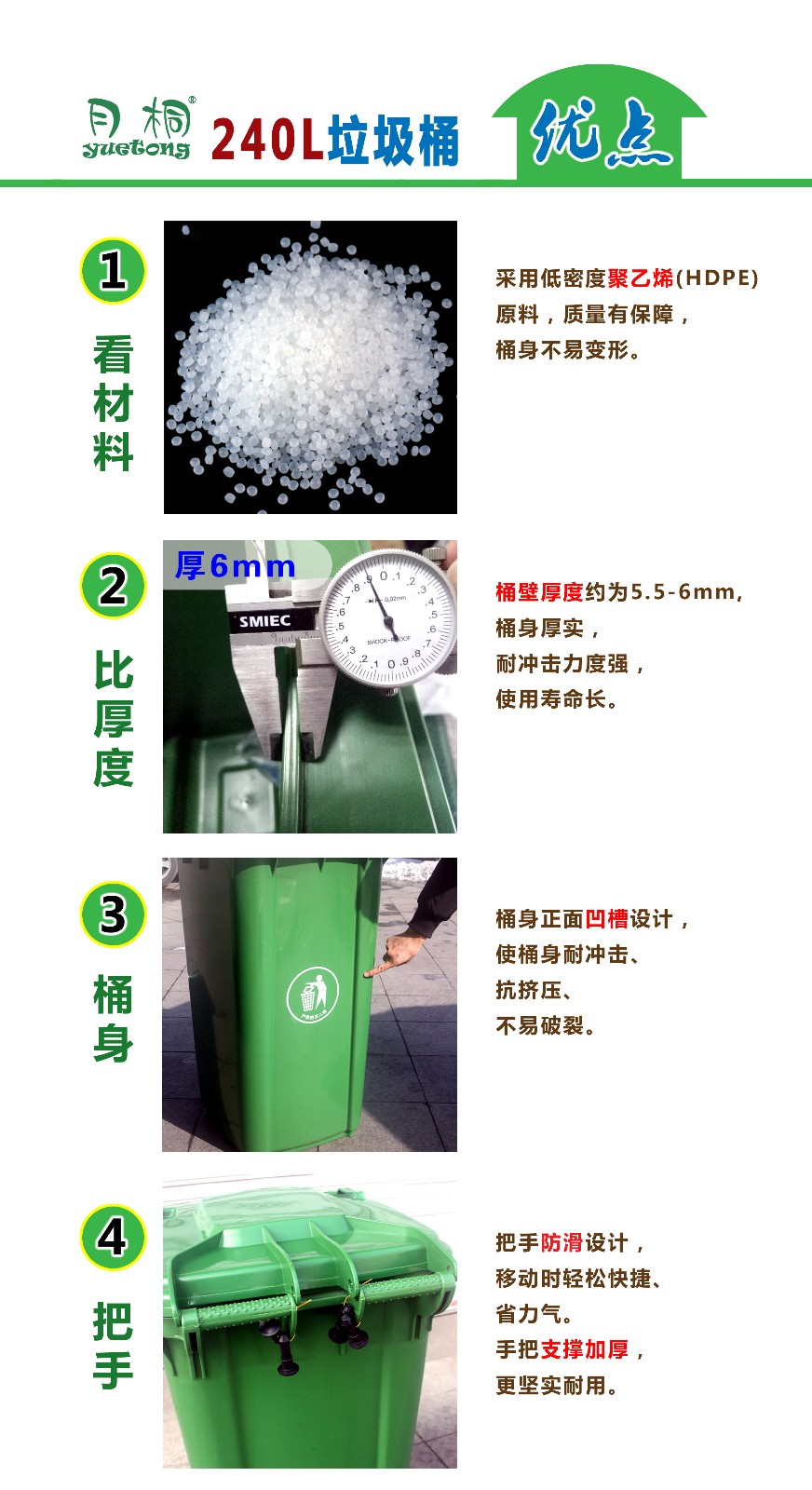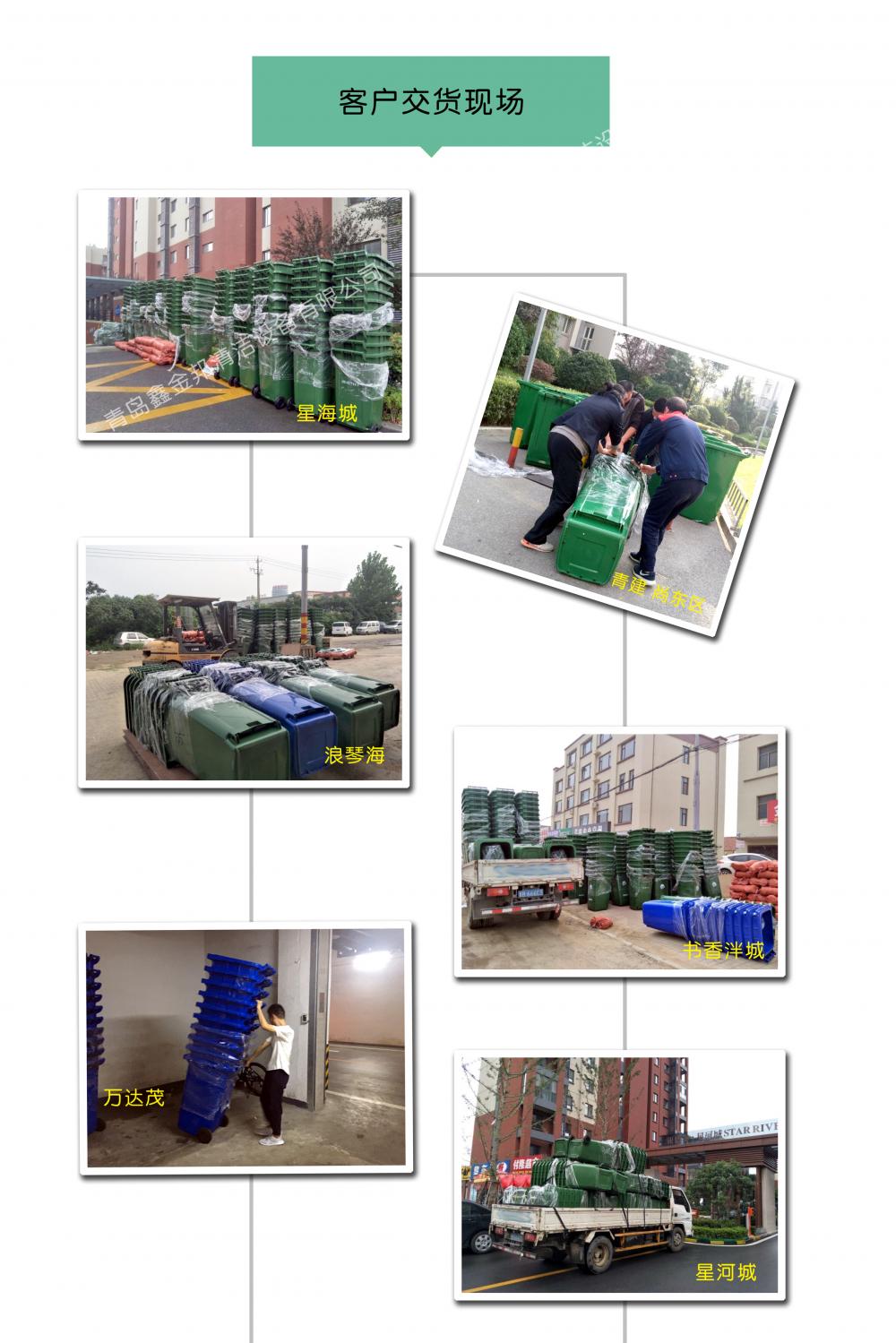 240升塑料垃圾桶采用環(huán)保材料特別加厚注塑而成,桶身表面光滑,方便環(huán)保人員清理。底部裝有靜音輪子,方便運(yùn)輸,使用壽命長(zhǎng),可配合和垃圾車使用。適用于:物業(yè)小氣、廚房、街邊等。青島鑫金邦垃圾桶質(zhì)量無憂、信譽(yù)有保障,歡迎來電咨詢!